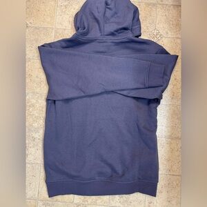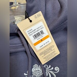 French Terry Graphic hoodie—color on tag is “purple sky”. —-in certain lighting it looks a little on the purple side. In other lighting it looks more of a grayish blue. Very cool. Nice embroidery on the front. Still has tags.