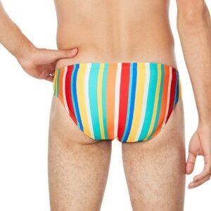 White, Orange, Red, Yellow, Blue stripes will make a bold statement in or out of the water wearing this swim brief.