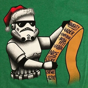 New with tags! Men’s/Unisex Star Wars Stormtrooper Holiday Christmas t-shirt. This short sleeve shirt has a Stormtrooper pretending he’s Santa checking his Naughty and Nice Christmas list. You know who is on the Naughty list!