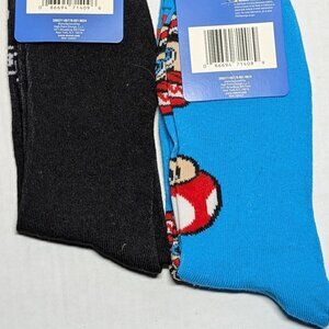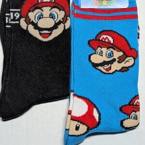 2 pair Super Mario Bros. socks. 1 pair blue with Marios head and super mushrooms all over. 1 pair black with Marios head and the year 1985, which was the year Super Mario Bros. came out. Sock size 10-13, fits shoe size 6 1/2 -- 12 NWT