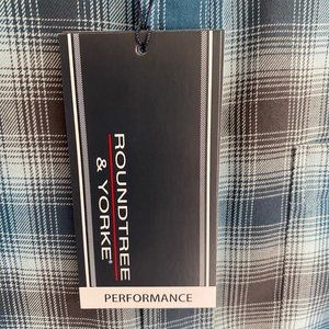 NWT Men's Turquoise Plaid shirt with grey and a bit of light blue. Button up the front with long sleeves, a front pocket, and a button-down collar. The fabric is really soft and is high quality. It is a Travel Smart Style that resists wrinkles. Looks Fresh all Day! The original easy-care, Travel-friendly line of Men's clothing. Outstanding quality, fit, and finish.100% Polyester. Well Made. Father’s Day Present? Great Gift for Dad! Made by Roundtree and Yorke. Size Medium New Never Worn.