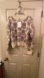 This sweater is an off-white or winter white with a brown floral pattern. Long sleeve rounded neck line.
