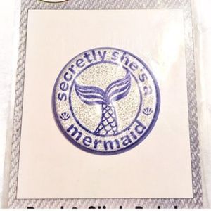 Adorable NWT circular blue/silver glitter patch with a mermaid’s tail and the words “secretly she’s a mermaid” on the front. This is a stick-on patch that is supposed to attach well to things like bags and shoes as a cool accessory. Would look awesome on a denim jacket!