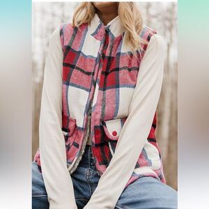 NWT Merokeety red/ blue/white zip front plaid vest with faux Sherpa lining sz L. Two front snap pockets. 100% polyester. Approximate measurements are pit to pit 22”, length from shoulder approximately 27”.