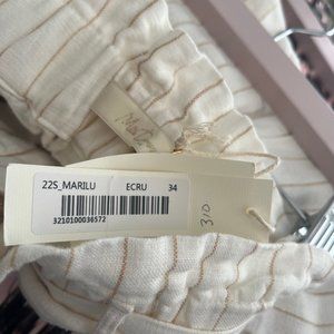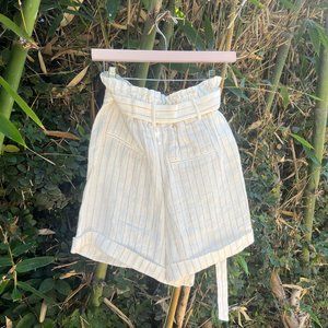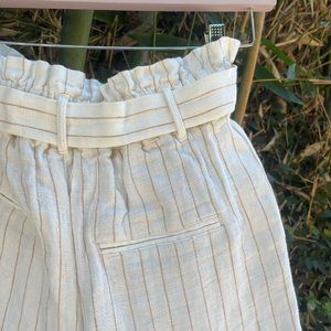 NWT Mes Demoiselles 100% linen cream shorts (size 34) - tan striped detailing, pockets, tie belt, hook and eye closure. Never worn.