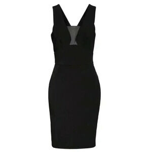A mesh inset centers the plunging neckline of this little black dress in a classic body-con silhouette that flatters your waist.