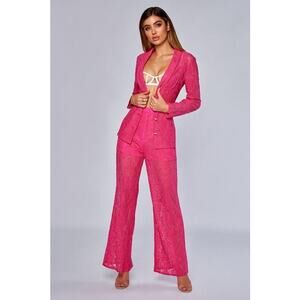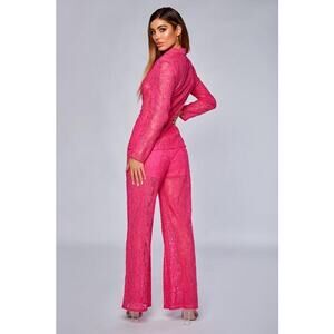 Brand new with tags! Meshki High Rise Krissy Wide Leg Lace Pant in Pink. Our KRISSY Wide Leg Pants are perfect for a fun and flirty vibe this season. Featuring delicate sheer lace fabric and a fitted waistband, these pants will make sure to hug all the right places. Sheer starting from upper thigh down. Perfect for concerts, festivals, or pride!