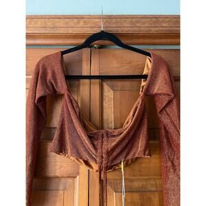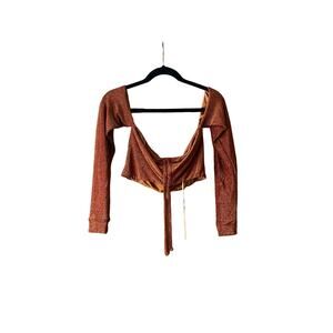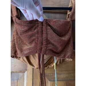 NWT Meshki Women's Rose Ruched Front Off The Shoulder Top Shimmer Orange Size M Description: Tie Front Back Zip Ruched Front Off The Shoulder Cropped Fully Lined Long Sleeve 76% Nylon, 20% Cannetille, 5% Elastane Machine Wash Cold Made in China Brand New with Tags! Chest: approximately 15" flat Length: approximately 12" flat BUNDLE to save! Offers welcome! Quick shipping!