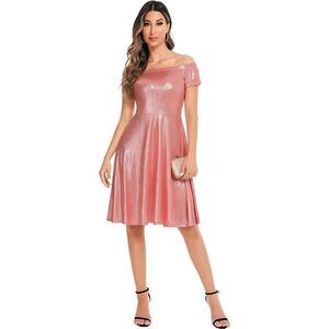 - Features: lined, cute cocktail dress, off shoulder, strapless, short sleeve, A-line, metallic glittery, solid color, elegant and sexy