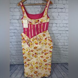 NWT Mew Mews Yellow Pink Corset Look Formal Party Elegant Chic Jacquard Dress S
