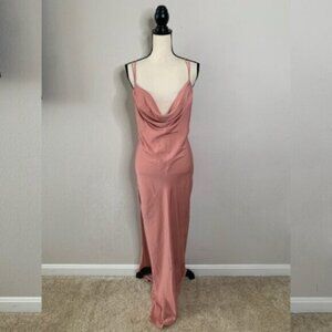 Turn heads in this effortlessly sultry mauve satin slip dress, the perfect balance of sophistication and allure. This dress features a soft cowl neckline that drapes elegantly across the chest. Ultra-thin spaghetti straps crisscross delicately across the open back. The silhouette is sleek and body-skimming, crafted from a silky satin fabric that glides smoothly over the figure. A thigh-high slit on one side adds a flirty edge while enhancing movement and showcasing the legs. The back features a dramatic draped cowl detail.