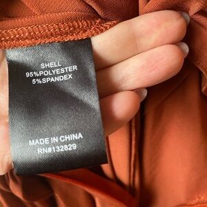 Michael Costello × REVOLVE Janet Jumpsuit in Burnt Orange. - size Medium 95% poly 5% spandex. Made in China. Dry clean only. Hidden back zipper closure with attached waist tie. Deep V-neck. Midweight slinky jersey fabric.