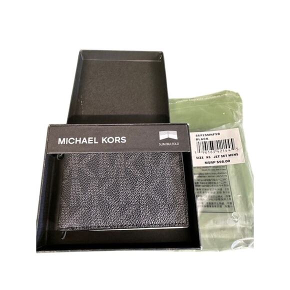 NWT Michael Kor Slim Billfold. Black with Michael Kor emblem on front and back. Closed measures 4.5'x3.5' Open measures 8'x3.5'