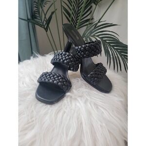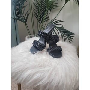 Brand new and never worn black strappy heels. Still in box with original packaging! Michael Kors high heel features a braided mule with a 3 inch stacked block heel. A high heel sandal heel that is a slip on, open toe style. Nappa faux leather. Two straps across the open toe. Perfect for a night out this fall!