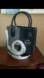 Stylish mini bag with signature MK pattern. Features dual-tone blue and gray design. Includes top handles and MK charm.