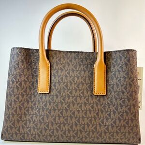 Stylish Michael Kors satchel with signature pattern. Features tan handles and matching pouch. Perfect for everyday elegance.