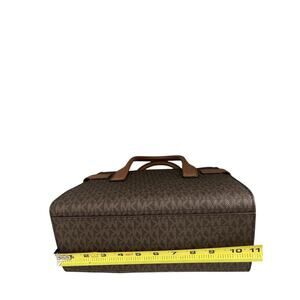 MSRP $558 - This is a NWT Michael Kors Carmen Medium Flap Satchel in brown, with a MK logo plaque lock and belted side gussets. It features a push lock closure, adjustable cross-body strap, and double handles in brown leather. The handbag has a coated finish, gold tone hardware, and a polyester lining in beige. It includes a detachable strap and key holder. Perfect for various occasions from casual to formal, this satchel exudes designer elegance.