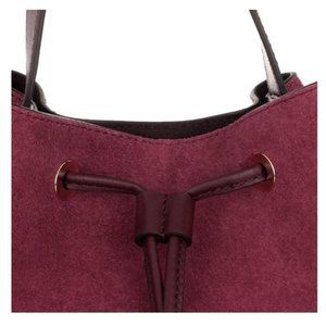 A Michael Kors bucket bag from the Cary collection crafted in suede and smooth leather and gold hardware. This bucket bag features 1 main compartment, drawstring closure, a zip pouch with pocket, and an adjustable strap with a 18"-20.5" drop.