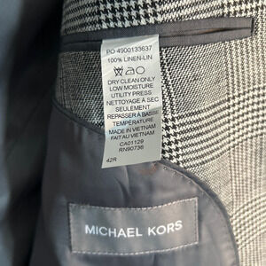 Keywords: linen blazer, plaid sport coat, black and white linen jacket, Michael Kors 42R, summer blazer, breathable suit jacket, wedding blazer, resort wear