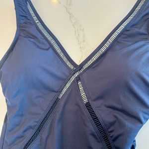 Brand new with tags. Michael Kors Navy blue one-piece swimsuit. Pull on swim with front v-neck and scoop back. Has criss-cross netting detail on the front. Medium to full coverage bottom.
