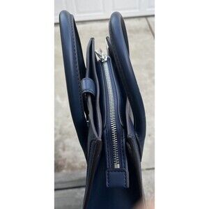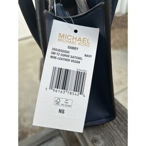 This is a new with tags Michael Kors Gabby small navy faux leather satchel crossbody purse. The bag features a rectangular shape with a top zip closure, blue leather handles, and a detachable strap. It is designed for various occasions and has a coated finish. The interior is lined with fabric and polyester, with inner pockets for organization. The bag also includes silver hardware and a logo pattern.