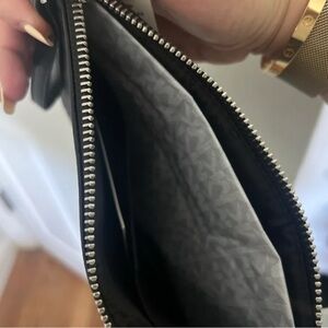 New with tags never used Michael Kors wristlet in dark grey canvas with black logo pattern and silver hardware. Zip closure. Non-zip pocket inside; original tissue and care card included.