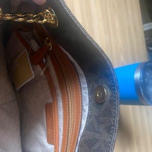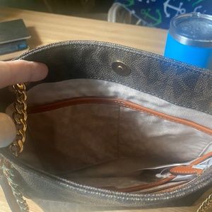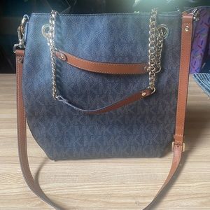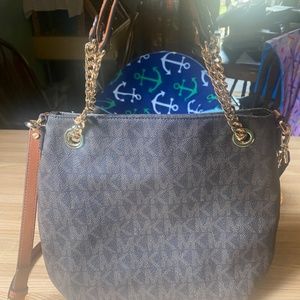 MICHAEL KORS MK JET SET CHAIN SHOULDER TOTE IN BROWN SIGNATURE. IT HAS AN MK GOLD KEY CHAIN CHARM ON CHAIN AND SHOULDER STRAP THAT ARE REMOVABLE. HARDWARE ON PURSE IS GOLD.