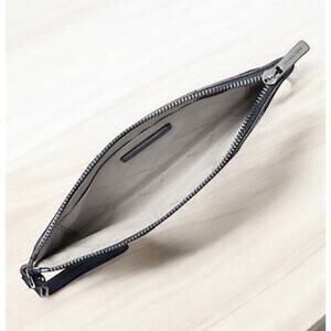 Exterior – Polyurethane blend (looks like leather), wrist strap, silver hardware and top zip closure.