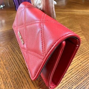 Michael Kors quilted PVC leather wallet with zip pocket at back. Interior includes: 1 window ID, 4 bill slots, and 16 credit card slots. Chili red color with gold tone hardware. Snap closure. 7" W x 4" H x 1.5" D.
