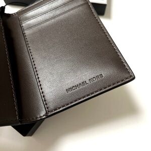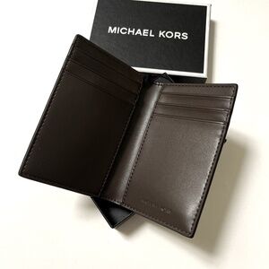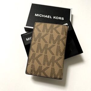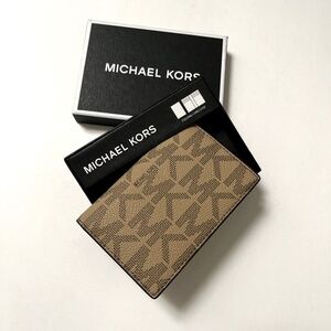 Keep it sleek and stylish with this Michael Kors Jet Set folding card case, crafted in camel brown MK monogram coated canvas with a smooth leather interior. Ultra-slim profile, bifold design, and packaged in original Michael Kors gift box — ideal for gifting or everyday minimal carry.