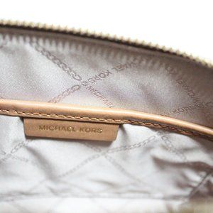 NWT Michael Kors pale gold Canvas Upper leather base Top zip closure interior features 1 interior credit card pocket. Gold-tone hardware. Measurements 6.75” L x 4.25” H x 1.5” D.
