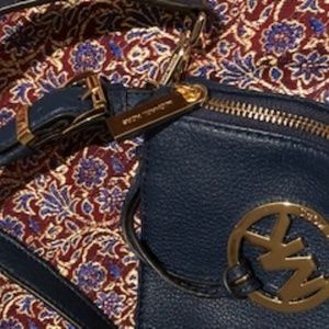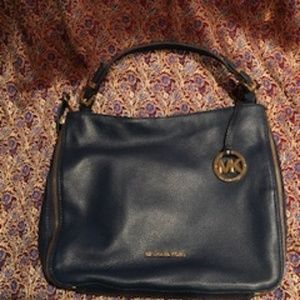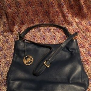 MICHAEL Michael Kors Large Essex convertible shoulder bag in navy leather with gold accents. This bag is perfect and stylish for every day use. It has top zip closure and an optional, adjustable crossbody strap for effortless versatility. Both exterior and interior zip pockets. 14"L x 11"H x 2.5" W. The bag I am selling is Navy