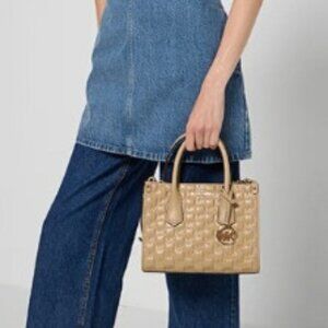 NWT ✅ Michael Kors MAPLE Small MK Embossed Leather Satchel CAMEL (Taupe) ✨NWT