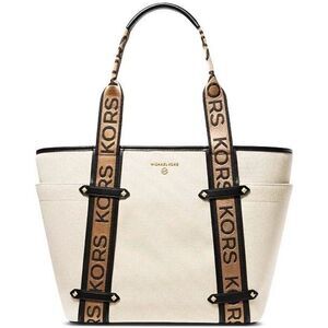 The Michael Kors Maeve Tote Bag in cream and black features two logo shoulder straps and a prominent gold-tone logo emblem on the front for a touch of luxury. It offers practical storage with an internal zip pocket and exterior side slip pockets. The bag is designed with two rounded top handles and a magnetic fastening for easy access. Finished with gold-tone hardware and leather trim, this tote combines style and functionality seamlessly.