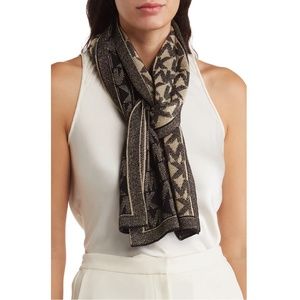 - With a signature logo monogram in metallic knit, this long scarf is a versatile accessory for your cold-weather ensembles.