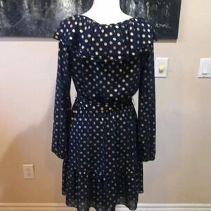 NWT Michael Kors Navy Blue/ Gold Floral Pattern Belted Tie Waist Ruffle Dress-M