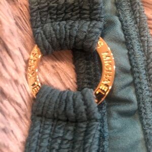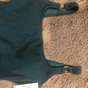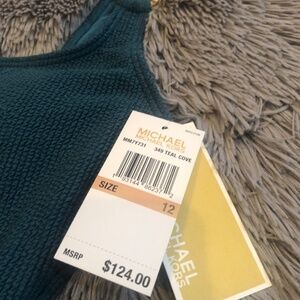 This is such a beautiful Michael Kors teal bathing suit. Never had the opportunity to use it. I bought some bathing suits earlier in the year for a summer vacation I had planned, but things didn’t work out and I couldn’t go after all. This is a size 12. It has the iconic gold Michael Kors hardware on the gold rings at the front of the bathing suit. This is a $124 bathing suit!!!!! Material on this swimsuit is just stunning!!!!( shown in picture 4)