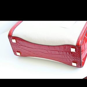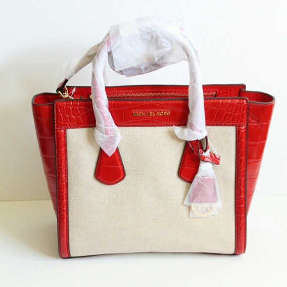 NWT Michael Kors Red & Ecru Colette Large Satchel. Croc Leather with canvas body. beautiful tote features Michael Kors Logo in Goldtone hardware Exterior features dangling MK logo dual rolled handles removable shoulder strap flat bottom with goldtone feet. Top zip closure with additional Side zipper at top for easy access storage. Interior features MK signature lining with one zip and three slip pockets. Tote measures 10.5"H x 14"W x 5"D. 7"handle drop. Ship with all original packaging material.
