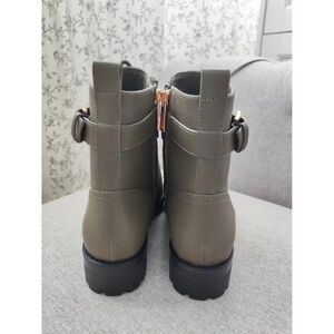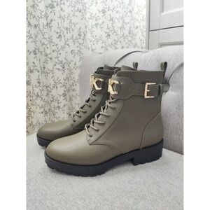 Brand new with tags and box pair of Michael Kors Reed lace up booties in olive green. Size 8M. Faux Leather. Gold MK symbol and hardware.