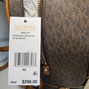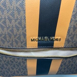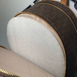 This Michael Kors backpack showcases a sophisticated blend of brown and tan hues, highlighted by the iconic MK monogram print. Crafted with attention to detail, it features tan leather accents that enhance its luxurious appeal. Ideal for daily use, this backpack combines style and functionality, making it a must-have accessory for any fashion-forward individual.