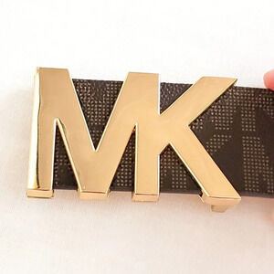 Large gold MK logo buckle. Dark brown and tan signature pattern. Pebbled texture faux leather.
