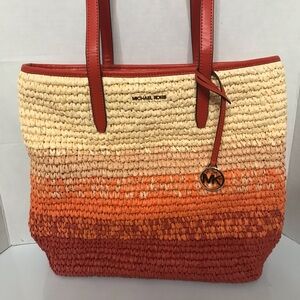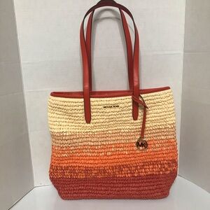 Style Tags: handbag, purse, pocketbook, spring, summer, MK, MK logo bag, orange, ombre, straw, casual, beachy, coastal, lightweight, boho, shoulder bag, durable, Michael Kors straw tote, MK handbag, summer bag, beach tote, vacation bag, woven purse, designer tote, boho chic, resort style, new handbag, women’s accessories