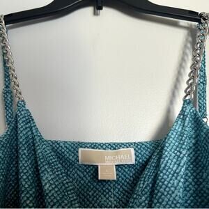 Keywords: Michael Kors dress, chain strap dress, blue cocktail dress, twist waist dress, camisole dress, sleeveless dress, women's large, wedding guest outfit, date night look, designer evening wear.