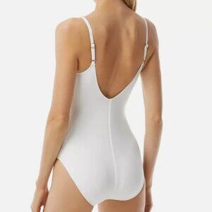 Stand out on the shore with this stunning white one piece swimsuit from Michael Kors, featuring a sash detail and gold-tone logo hardware. Pull-on styling with V-front, adjustable over the shoulder straps and removable soft cup padding. Full bottom coverage and fully lined. Nylon/Spandex blend, feel free to message with any questions. Thank you for shopping with us and have a great day!