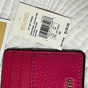 Brand new electric pink leather card holder. Holds 3 CC’s and your Drivers License. Pinch opening can hold small amount of cash or receipts. Does have a funny little spot above the gold MK logo. See pic