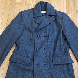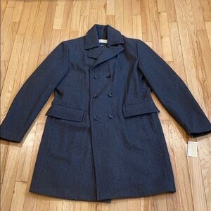 Mens peacoat. Approximate measurements flat: pit to pit 22, length 40.5. This is a size 42L. Wool blend long peacoat. Brand new. Never been worn. Dark Grey color. Pockets. Smoke and pet free home. This is a warm coat.
