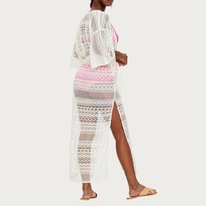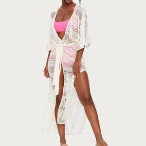 New With Tags Michael Stars beach or pool cover-up in a beautiful cream lace crochet with short sleeve and long duster length! This is a super versatile travel staple, cute over a tank with jeans or a skirt.