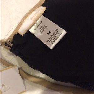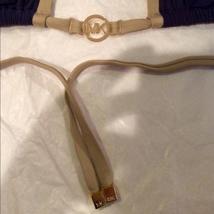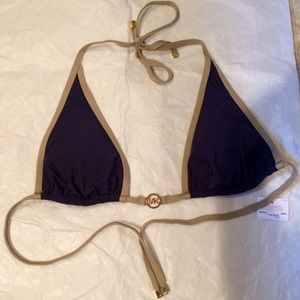 NWT Michael by Michael Kors string bikini top in navy and tan, featuring gold logo accents. Size medium. Never tried on or anything