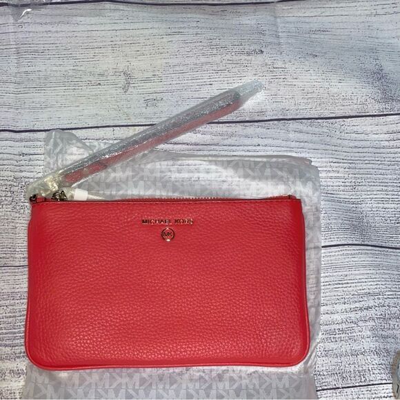 Michael Kors Jet Set Charm Medium Top Zip Wristlet. This wristlet will have you keep the essentials within easy reach. It’s crafted from pebbled leather with polished hardware for a sophisticated finish, while the zip fastening opens to a surprisingly roomy interior equipped with a slip pocket and ample card slots. Carry it alone by the smooth strap when you want to travel light, or toss it into the coordinating tote.