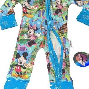 New with tags adorable holiday bamboo onesie featuring Mickey & Minnie in a gingerbread village Christmas print — gingerbread houses, peppermint candies, presents, cookies, cocoa mugs, trees, and bright winter colors. Soft and stretchy bamboo blend.